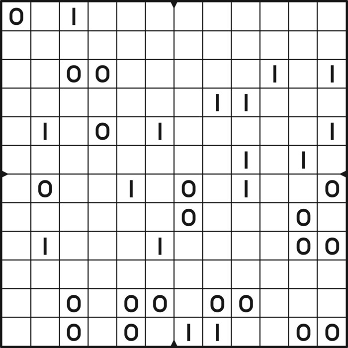 A daily binairo puzzle! Solve each puzzle with only 0's and 1's. Remember: No more than two the same numbers may be placed directly next to or below each other. Every row and every column must contain as many zeroes as ones. The combination of zeroes and ones in every row must be unique, as does the combination in each column.