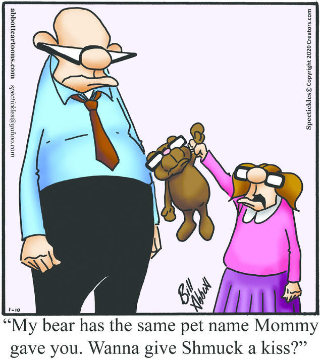 Spectickles, a cartoon primarily about a married couple with, to put it mildly, communication challenges, is an amalgamation of physical traits that author Bill Abbott finds humorous: the deadpan expression and gravity-tugged flesh of Walter Matthau, the powerful presence of Ethel Merman, the glasses of his great-grand-parents and a host of other subtleties.